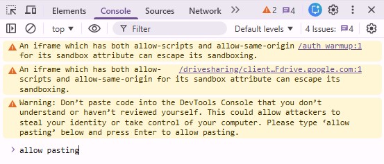 Selanjutnya tulis Allow Pasting untuk mengakan console